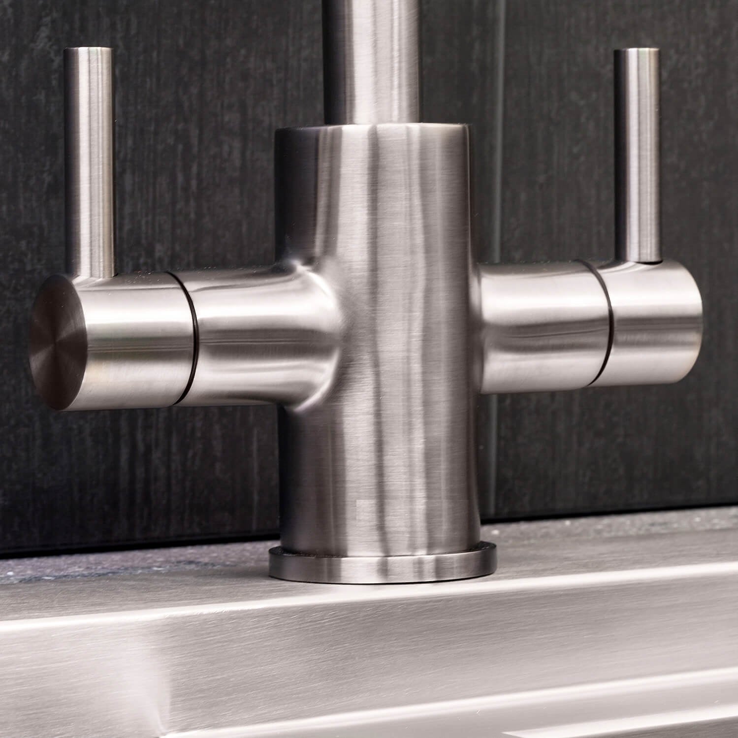 Evolution Brushed Nickel Twin Lever Kitchen Mixer Swan Neck
